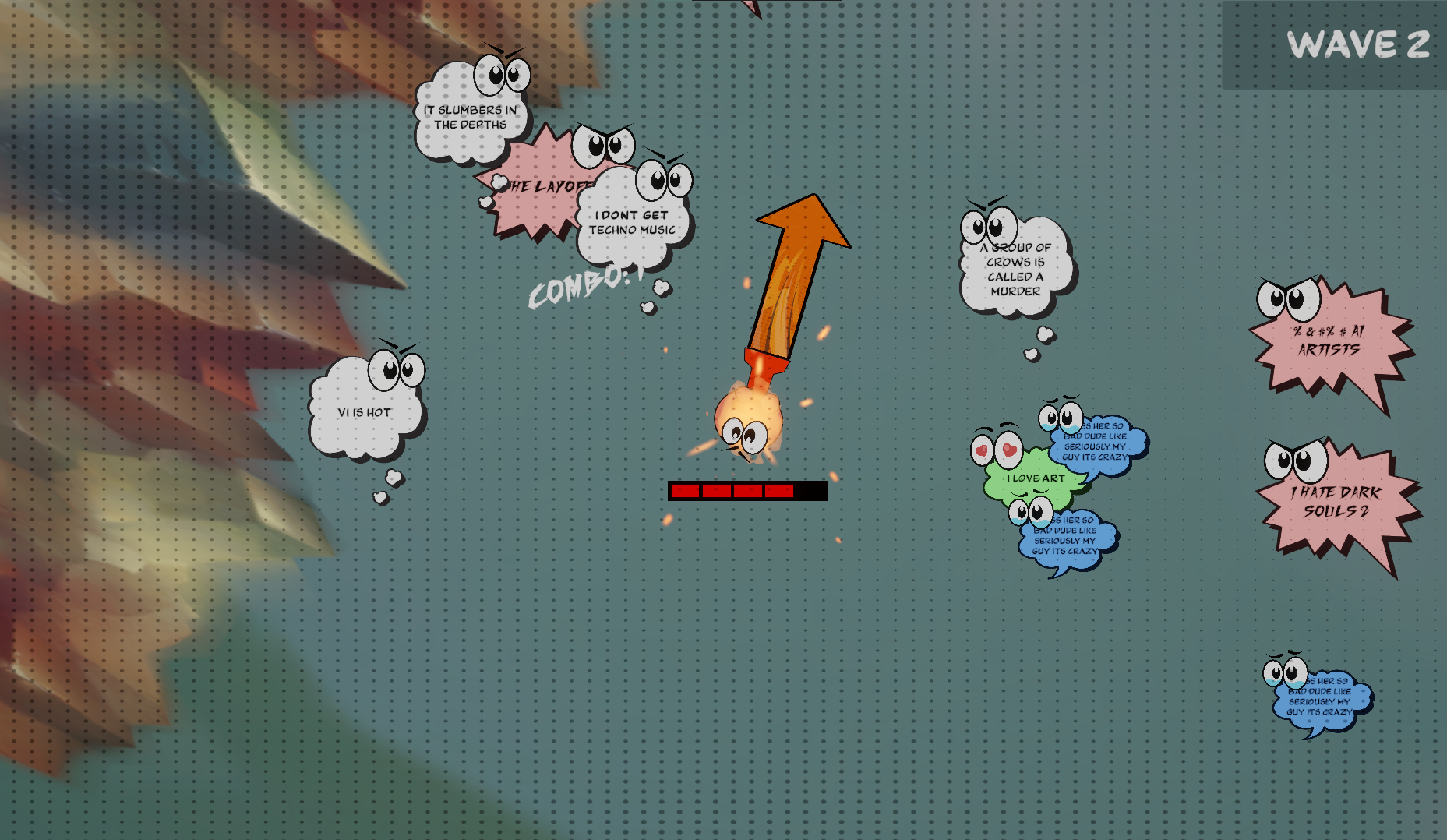 Use WASD to move, aim with your mouse, and hold click to charge up. Release to dash forward and pop those pesky thoughts. Clear your mind one explosion at a time!